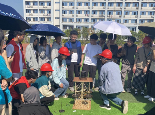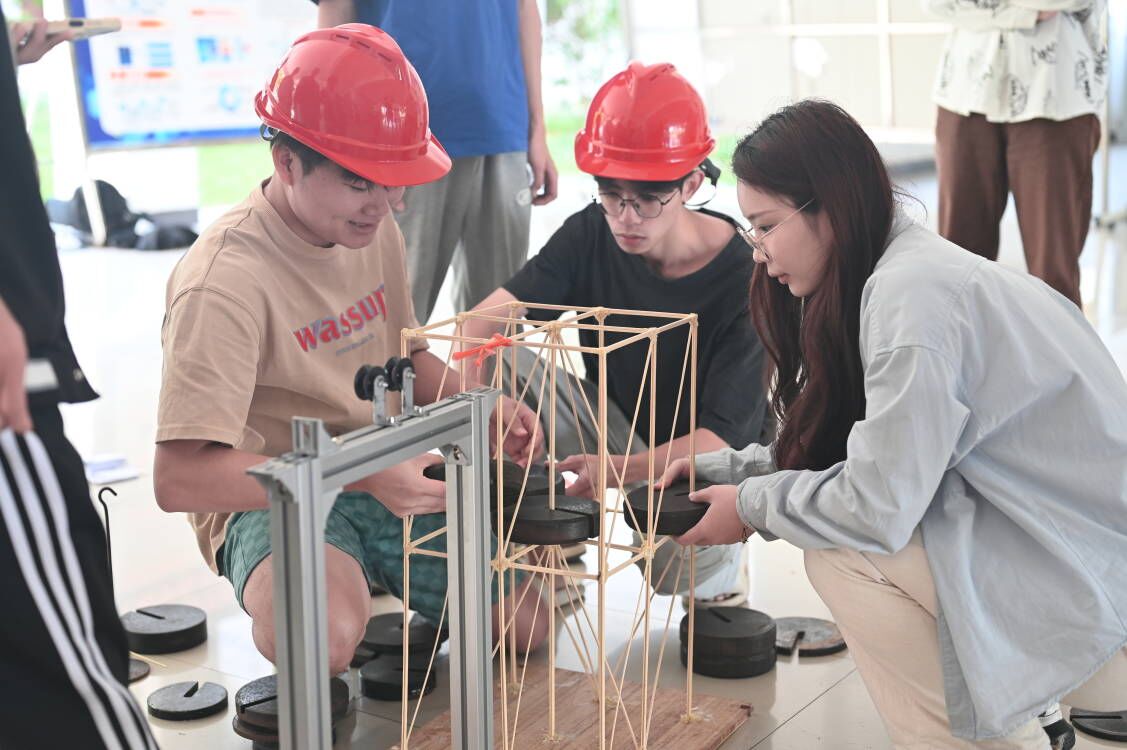 在经过前期培训、自主设计、模型制作等多个环节后,各参赛队向现场评委展示模型,同时将多层结构建筑模型放置于加载装置上进行现场加载。经过紧张激烈的加载,最终评选出一等奖3名、二等奖4名、三等奖7名。